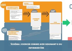 Ce schéma détaille le parcours pour les personnes étrangères souhaitant exercer comme aide-soignant·e ou infirmier·ère en Belgique.